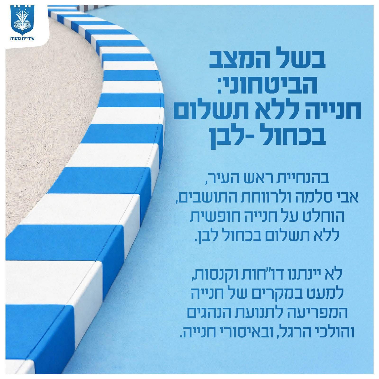 על רקע המצב הביטחוני ובהנחיית ראש העיר אבי סלמה, הוחלט על מתן חנייה חופשית ללא תשלום בכל אזורי הכחול־לבן בעיר, זאת במטרה להקל על התושבים בתקופת החירום.