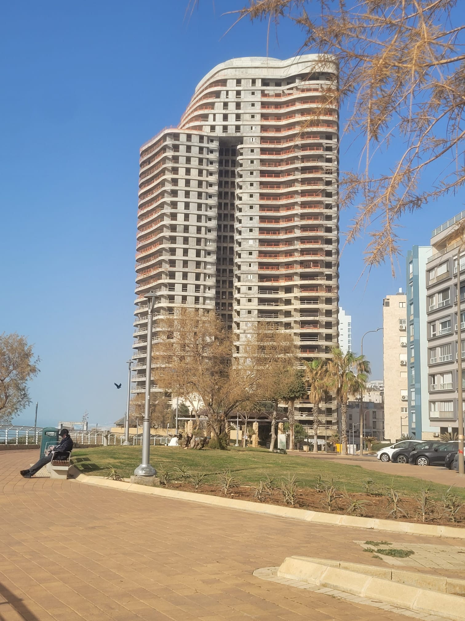 המתחם כולל גם שלד למלון בקומות התחתונות, חיבור מתוכנן בין טיילות ומעלית לים – אלמנטים שחלקם כבר נבנו אך לא הושלמו. התושבים מדגישים כי מעבר לסוגיית הבטיחות, מדובר גם במפגע אסתטי ותכנוני בלב רצועת החוף.